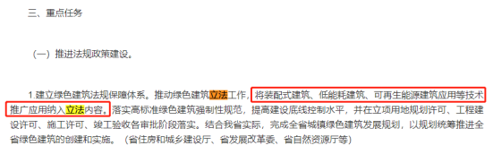 在重點任務(wù)中,提出推進(jìn)法規(guī)政策建設(shè):推動綠色建筑立法工作,將裝配式建筑、可再生能源應(yīng)用等技術(shù)推廣應(yīng)用納入立法內(nèi)容。