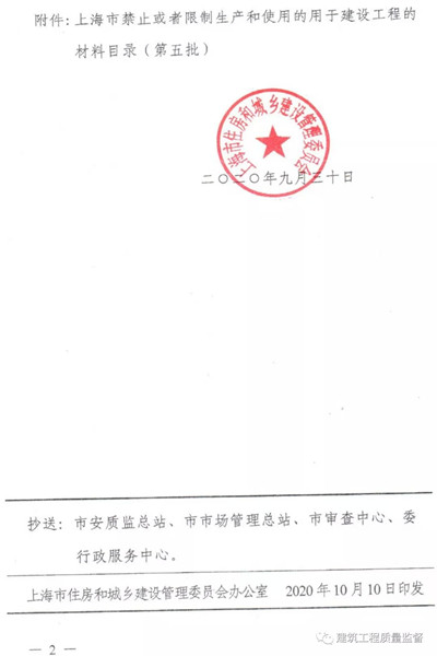 2020年9月30日,上海市住房和城市建設(shè)管理委員會關(guān)于公布《上海市禁止或者限制生產(chǎn)和使用的用于建設(shè)工程的材料目錄《(第五批)》的通知