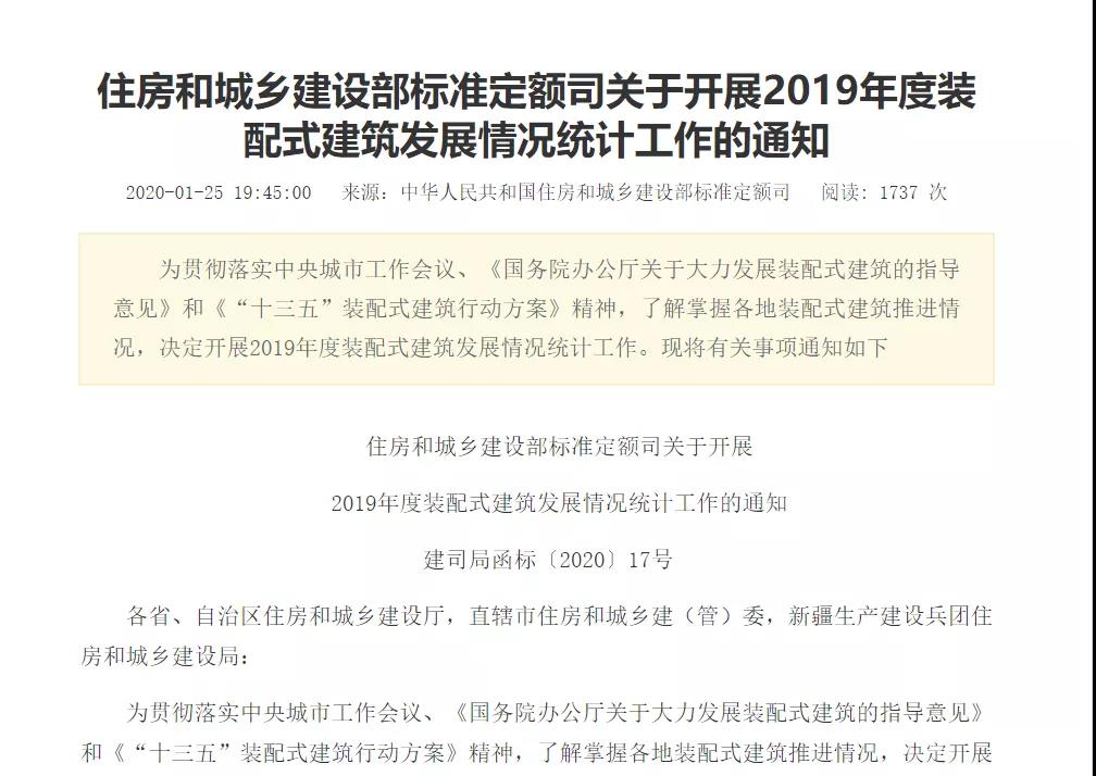 2020年1月25日,住房和城鄉(xiāng)建設(shè)部標(biāo)準(zhǔn)定額司關(guān)于開展2019年度裝配式建筑發(fā)展情況統(tǒng)計工作的通知,內(nèi)容強調(diào):